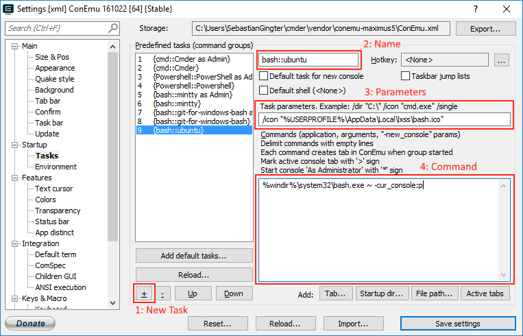 Step 2: The first input field of the dialog is the task name. I named it ’ bash::ubuntu’ but the naming is completely up to you. You can use double colons for grouping, so this would be the ’ Ubuntu’ task in the ’ Bash’ group. Cmder already comes with a ’ Bash’ group containing entries for Bash on mintty (using Cygwin) and another one based on on git-for-windows. To distinguish between the other Bashes and the ‘real’ Ubuntu thing, I simply chose to also opt into this naming scheme.