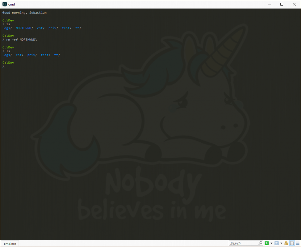 Cmder is a console emulator for Windows. It is my preferred way to use the Windows console (cmd.exe) for the last years, as it allows me to use *NIX commands like ls, less, grep and the like. For me, Cmder is a much nicer overall experience on the command line in Windows, and it makes me much more productive.